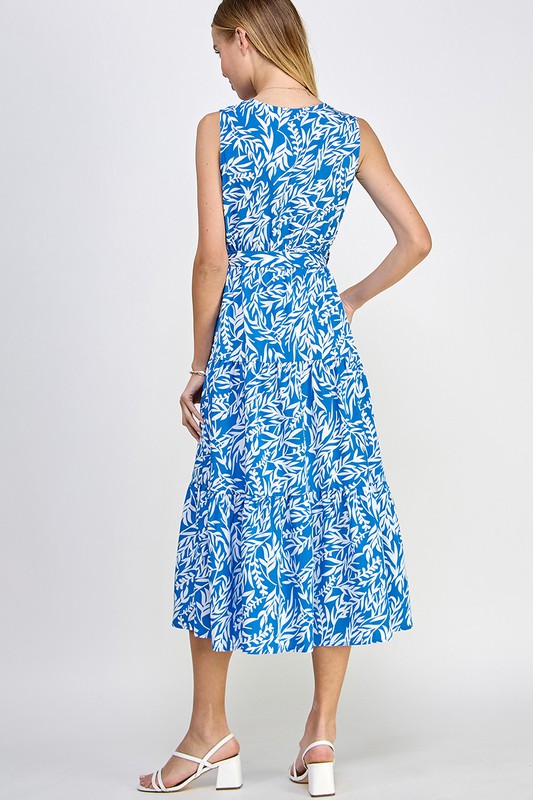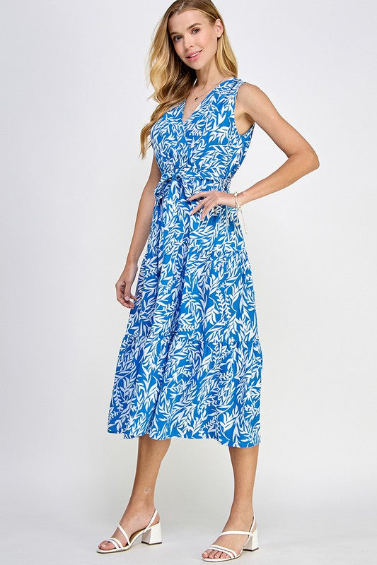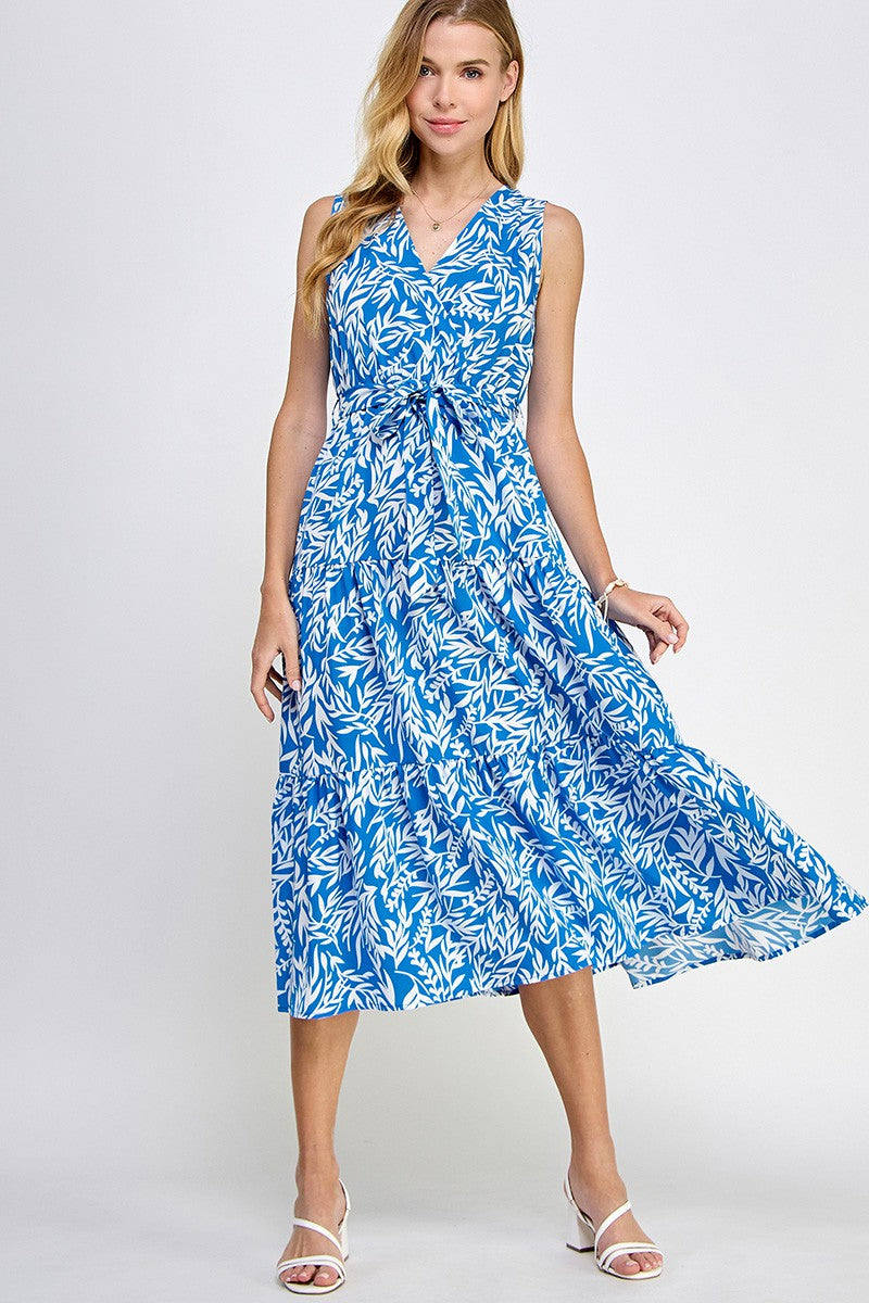 A coastal‑inspired midi dress featuring a vibrant blue leaf print and a relaxed, flowy fit. The tiered skirt and waist tie create a flattering silhouette for any warm‑weather occasion.