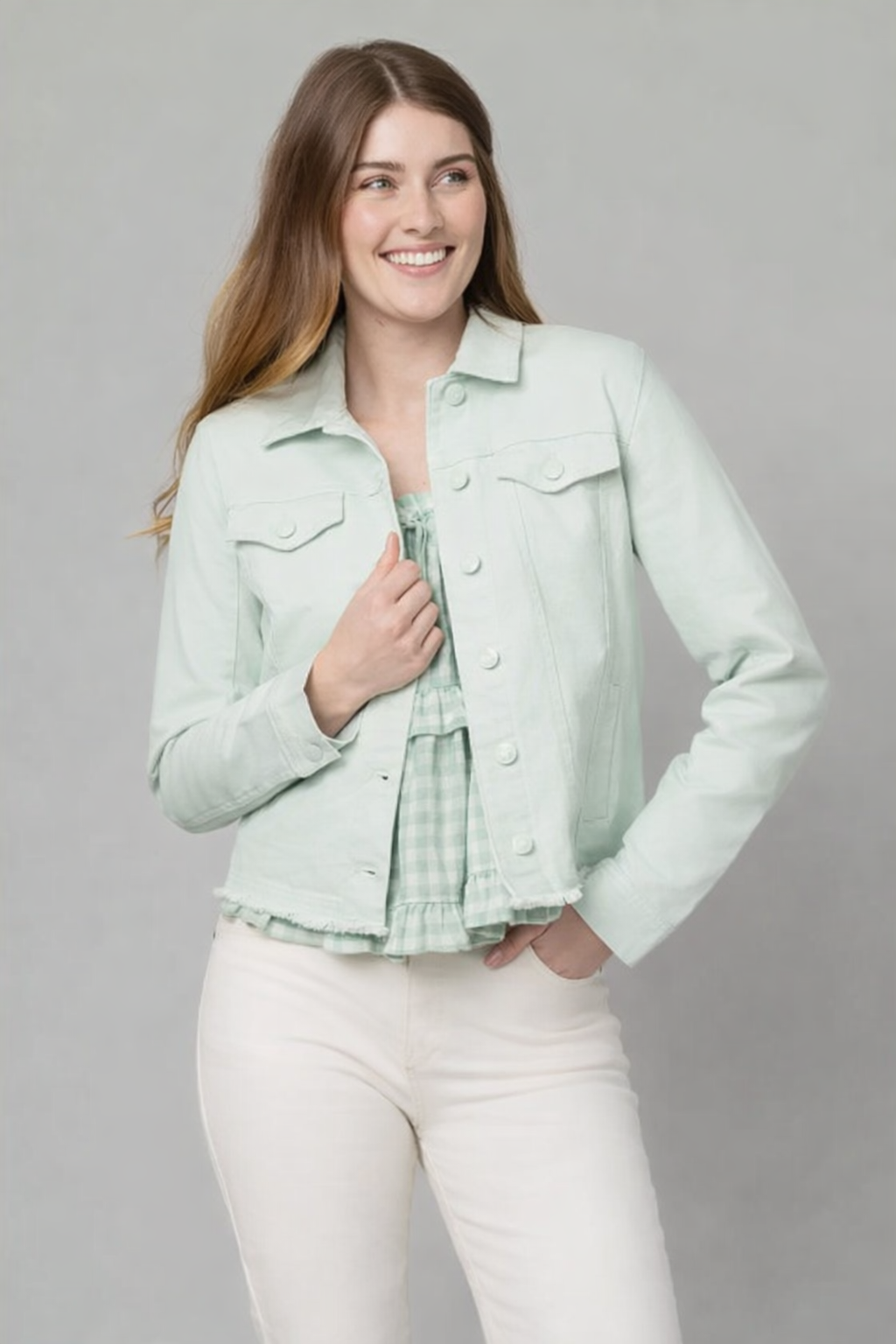 This mint denim jacket is your spring essential. The soft pastel shade pairs beautifully with any look, while the frayed hem detail adds contemporary edge. Layer it over dresses, tees, or sweaters for effortless style that works from casual to polished. A versatile wardrobe staple that feels fresh and on-trend.
