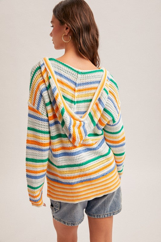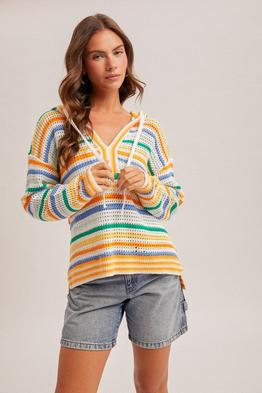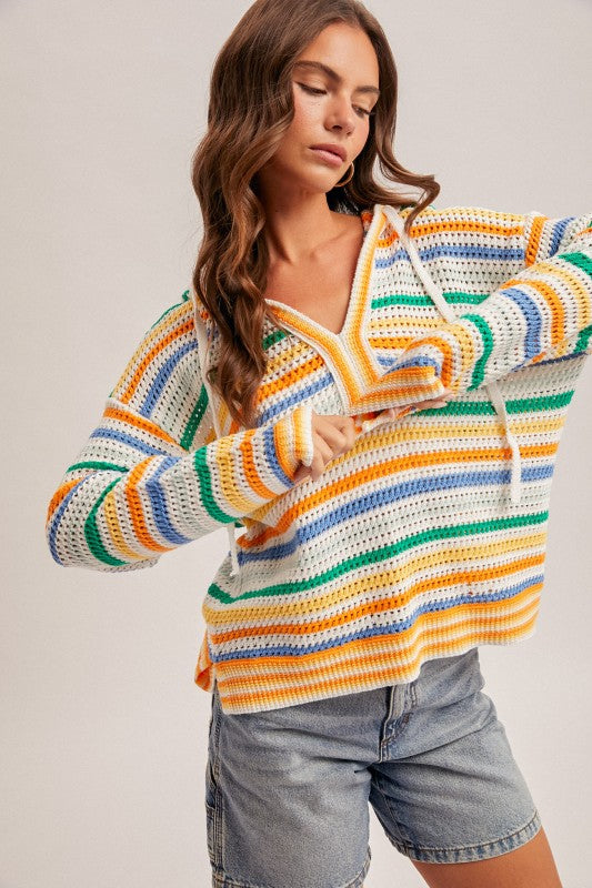 A vibrant crochet‑knit hoodie featuring bold multicolor stripes and a relaxed V‑neck design. Lightweight, breathable, and perfect for sunny days or beach‑town style.
