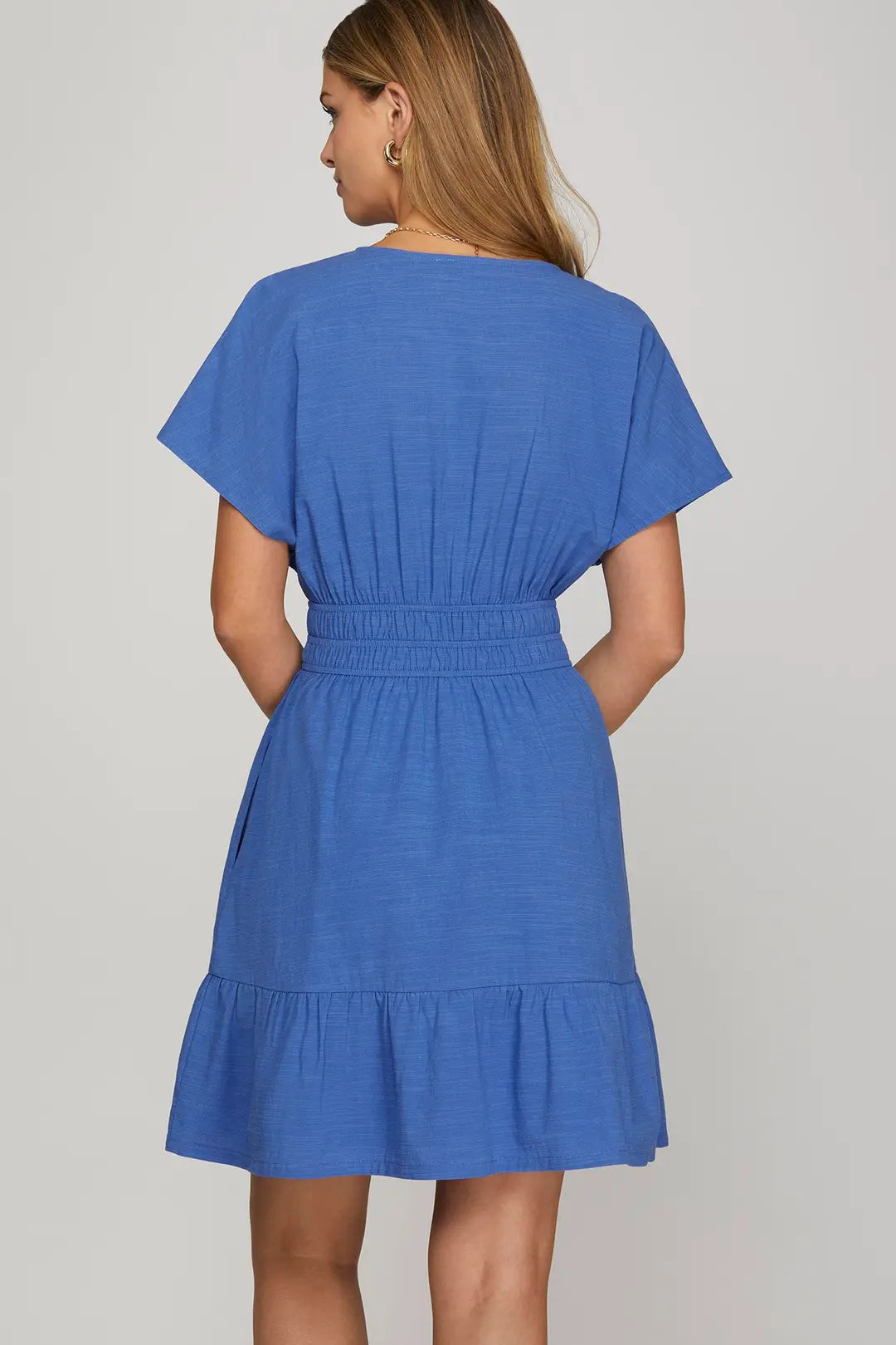 Royal blue tiered dress with functional side pockets. Flattering layered silhouette in soft, breathable fabric blend. Perfect for casual outings or dressed-up occasions. Comfortable and stylish everyday wear.