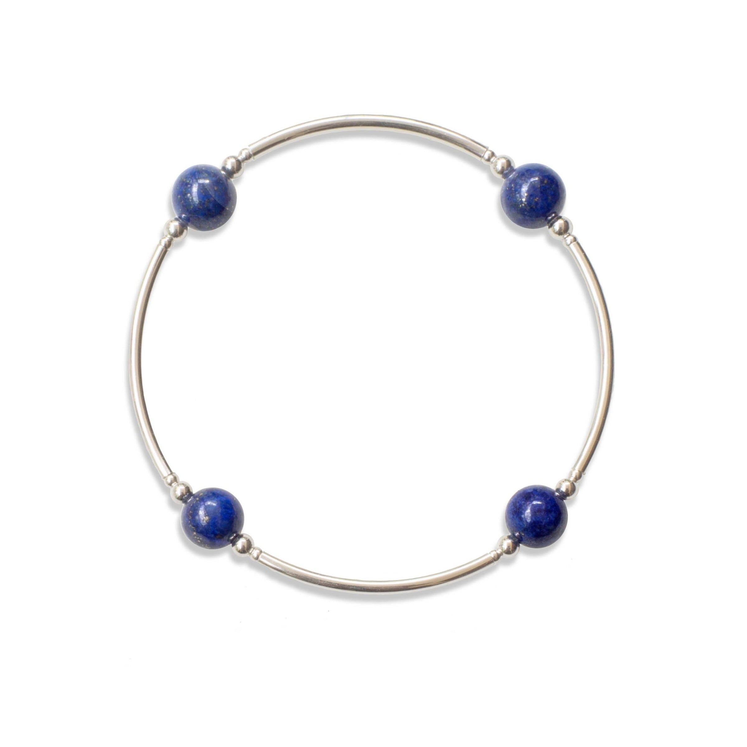 Elegant Sterling Silver Gratitude Bracelet; 8 MM Lapis Beads and Sterling Silver Links, Strung on Stretch Nylon; Standard Size fits most, up to 7" Wrist; Larger size fits up to 8" Wrist